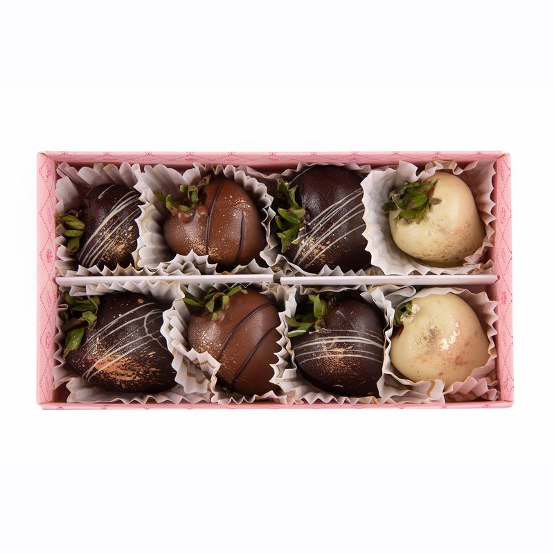 Fresas cubiertas artesanalmente con chocolates originarios de diferentes partes del mundo.